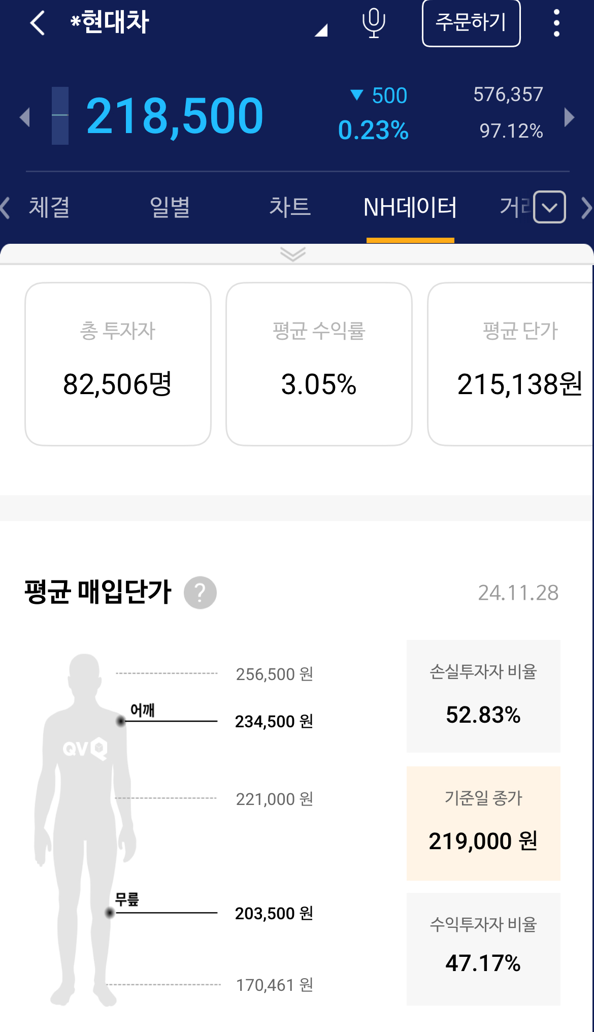 우리나라 산업의 메인중 하나인 자동차 현대차입니다. 이역시도 투자자 절반정도가 수익을 내고 있습니다. 투자자의 절반정도 수익을 내면 좋은 주식이라고 봐야 할거 같은데요.