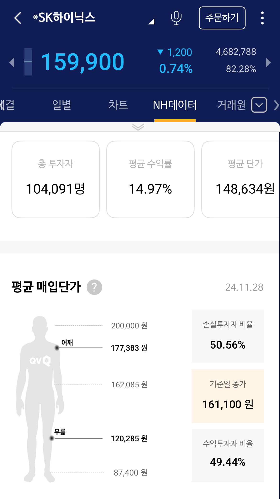 우리나라 반도체를 이끌어가고 있는 엔비디아와 동맹으로 좋았던 하이닉스는 투자자의 절반은 수익을 , 절반은 손실 구간이군요. 이좋은 주식이...